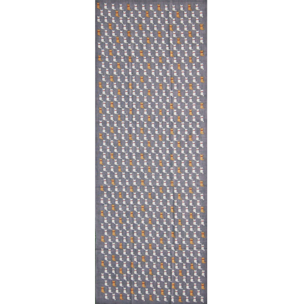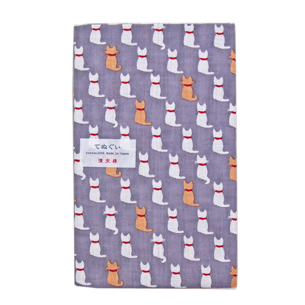 グレーの生地に小さい白猫と茶猫がいっぱいのてぬぐい。
