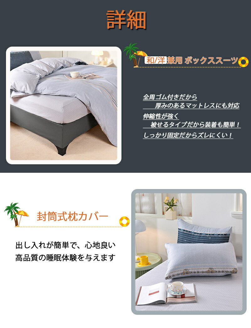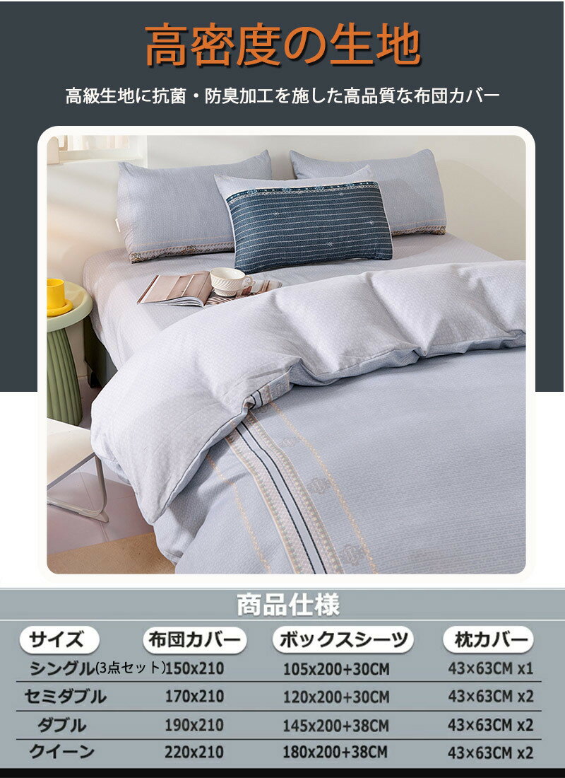 サイズ/寸法【シングル 3点セット】 布団カバー(1枚):150x210cm ボックスシーツ(1枚):105x210+30cm 枕カバー(1枚):43x63cm 【セミダブル 4点セット】 布団カバー(1枚):170x210cm ボックスシーツ(1枚):120x200+30cm 枕カバー(2枚):43cm*63cm*2点 【ダブル 4点セット】 布団カバー(1枚):190x210cm ボックスシーツ(1枚):145x200+38cm 枕カバー(2枚):43cm*63cm*2点 【クイーン 4点セット】 布団カバー(1枚):220x210cm ボックスシーツ(1枚):180x200+38cm 枕カバー(2枚):43cm*63cm*2点四季適用通気性と吸放湿性優れて、夏の場合は、汗をかいても素早く湿気を吸い取り、発散してくれるのでいつでもサラサラとした肌触りです。