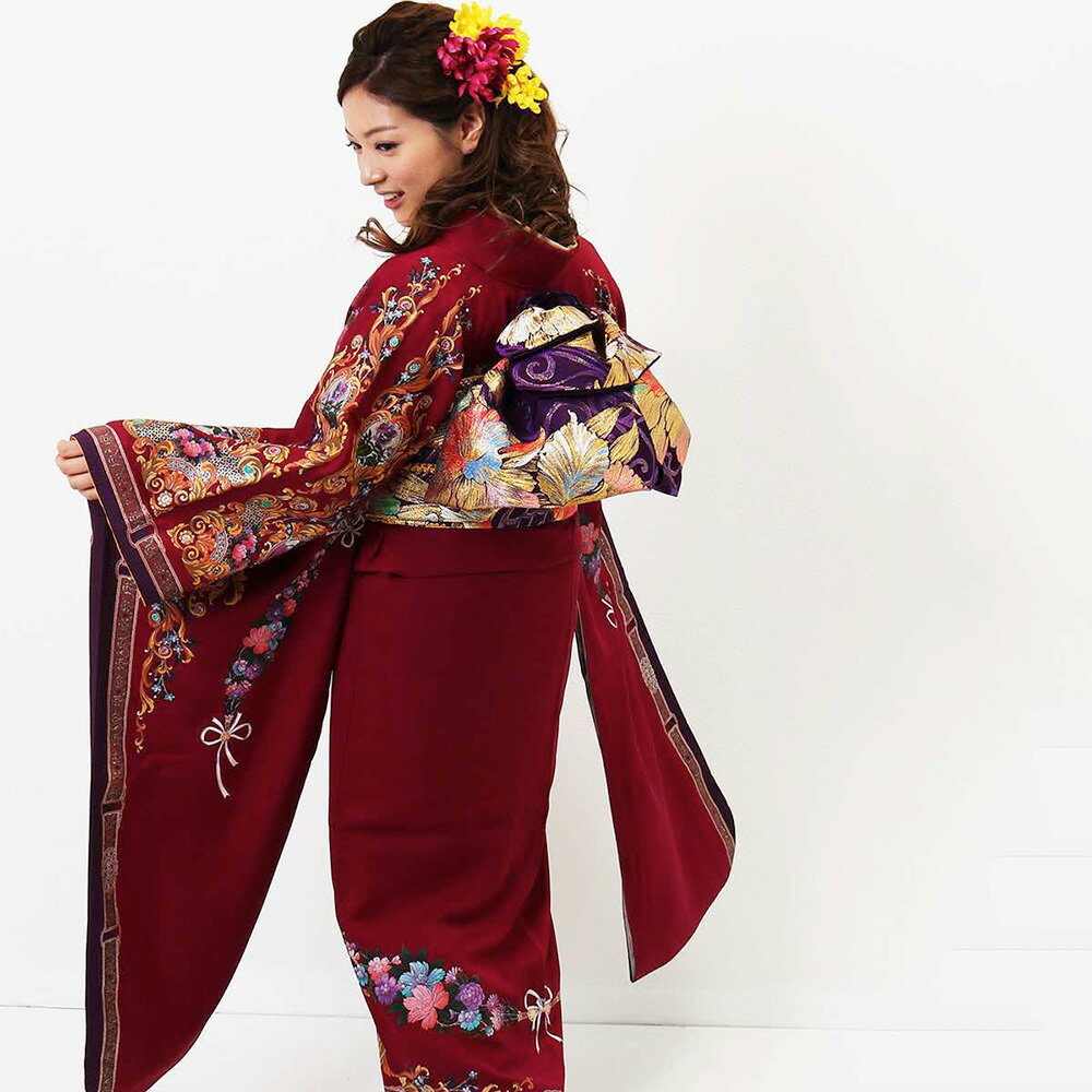 |送料無料|振袖 レンタル【レンタル】【成人式】 [安心の長期間レンタル]【対応身長155cm〜170cm】【正絹】レンタル振袖フルセット-122 花柄 レトロ クール系 ポップキュート 赤系 金彩 薔薇 リボン★和服 和装 おしゃれ