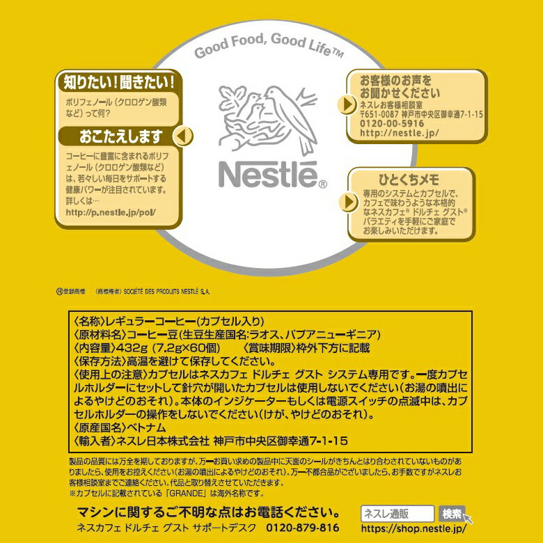 【名称】:レギュラーコーヒー(カプセル入り) 【内容量】:432g (7.2g×60個) 【保存方法】:高温を避けて保存してください。