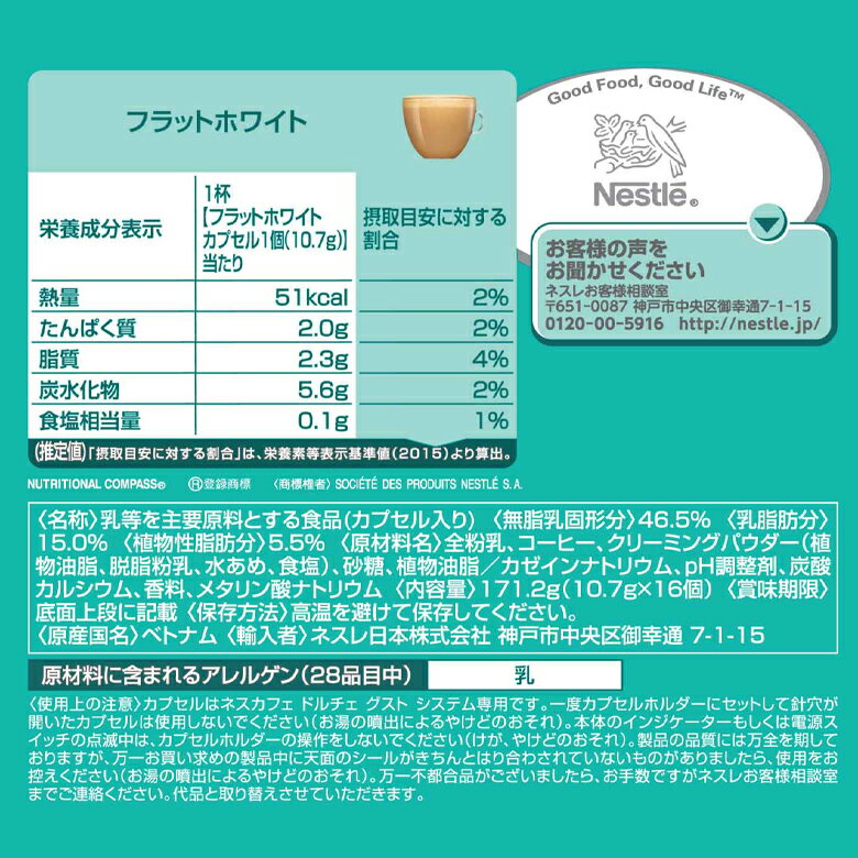 【アレルゲン情報】:原材料に含まれるアレルゲン(28品目中)乳 【原材料名】:<無脂乳固形分>46.5% <乳脂肪分>15.0% <植物性脂肪分>5.5% <原材料名>全粉乳、コーヒー、クリーミングパウダー(植物油脂、脱脂粉乳、水あめ、食塩)、砂糖、植物油脂/カゼインナトリウム、pH調整剤、炭酸カルシウム、香料、メタリン酸ナトリウム 【原産国】:ベトナム 【輸入者】:ネスレ日本株式会社神戸市中央区御幸通7-1-15